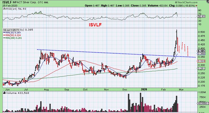 ISVLF – So I drew this yesterday & mentioned that some of these extended stocks ( ISLVF, NEM, AUY, ELYGF, etc) could pull back quite a bit, and that may become a buy opportunity. Well let me explain something with ISVLF…