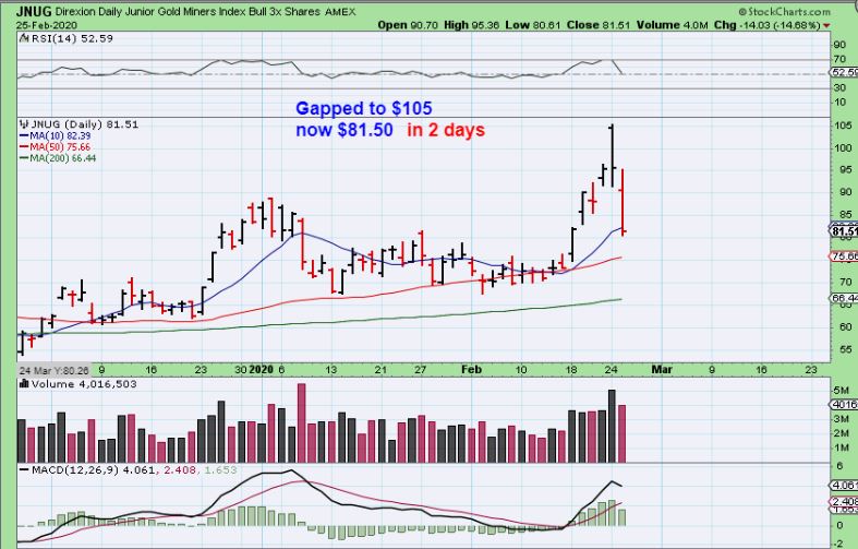 JNUG FOR PERSPECTIVE – JNUG gapped open Monday to $105, and dropped in 2 days to $81.50. THIS IS WHY I ALWAYS WARN ABOUT PROPER ENTRY (Not chasing & buying high) and position size and stops. Look at this drop. That is a big 2 day drop, with 14% down yesterday alone.