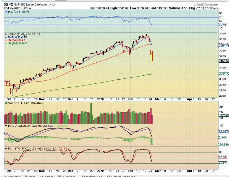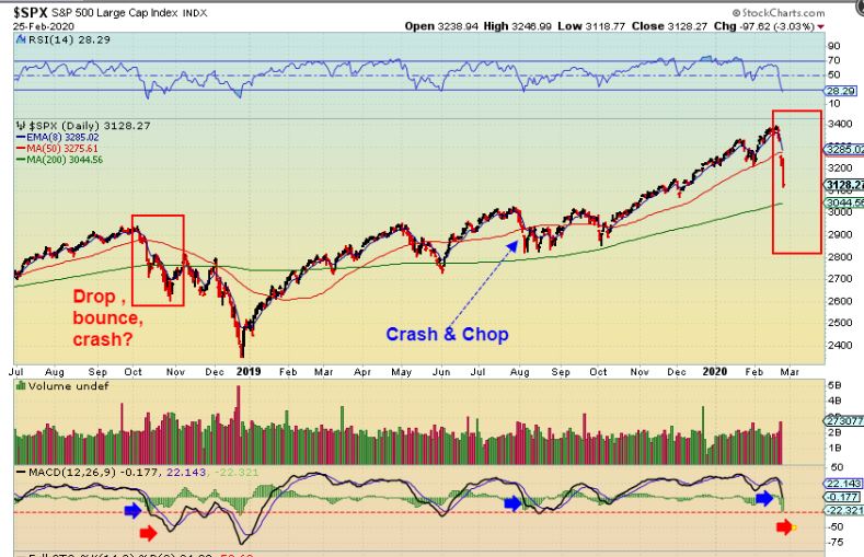 SPX – Let’s just say that the crash has had some follow through as the SPX dropped another 100 points. The Dow dropped over 1000 points on Monday and another 900 on Tuesday. Notice if you will that ALL GAINS FOR THE 2020 BULL AND EVEN DECEMBER HAVE QUICKLY BEEN ERASED IN just 2 DAYs, yet this is not even really oversold yet.