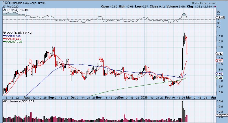 EGO – Well what a difference 1 day made. EGO , screaming higher from the good earnings report, dropped 13% Thursday. It was near $10 at 1 p.m., and kept selling off into the close.