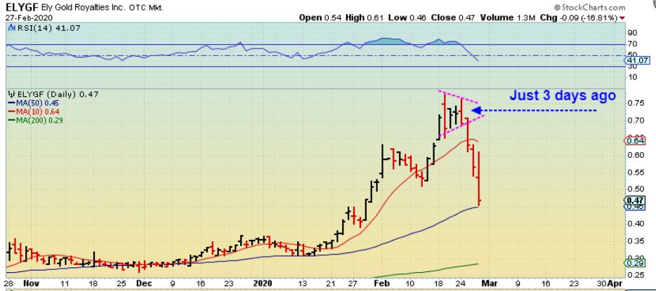 ELYGF – 3 days ago this was trying to form a bull flag near the highs, but this shows the damage that a day or 2 can do if you get caught in a landslide. THIS IS WHY it may be best to sell even the good ones before they get caught up in some selling.