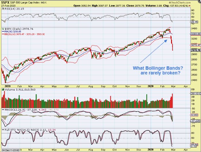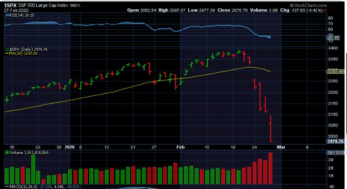 The Dow, supposedly a bit safer place to put your funds, dropped from 29,500 to 25,700 in days. 1,000 / day at times. Panic selling takes over as everyone heads for the exits at once.