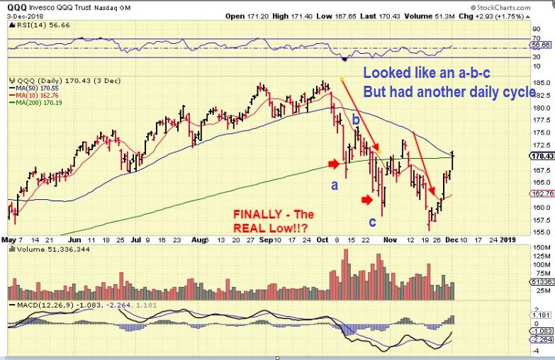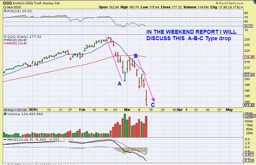 QQQ -WE HAVE SEEN AN a-b-c Type of drop.    In the weekend report I am going to post a warning. I know that many people think that an a-b-c drop is the end of a sell off, and we rally to the highs again- but that is not always the case, and this chart may now be a broken chart.