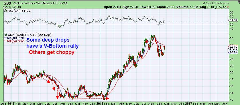 GDX – Sometimes after a steep sell off, we see a repair job & not a V-Bottom. Sometimes we get a V-Bottom or a V-Bottom with a quick drop to the lows before moving higher…
