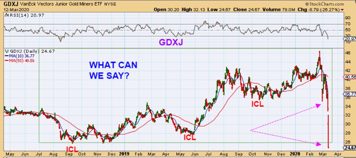 GDXJ WEEKLY AGAIN –  So let’s just be honest, I will look into everything for the weekend report, but we are in unprecedented territory.  I can give you guidance along the way, and give us things to look for, but I cannot say with 100% certainty how this will play out.  For example…