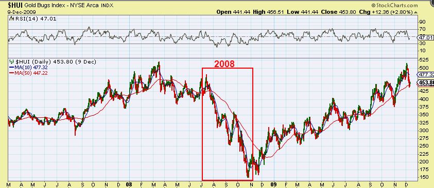 HUI endured a large sell off in 2008  and formed a bit more of a V-Bottom with a  2nd quick drop to form higher lows before moving higher…