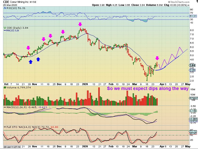 CDE – And I just want readers to know that this run does NOT have to be straight up. We can see Multiple days down and remain healthy. So CDE stalled Thursday, and people automatically wonder, “What is wrong with CDE?”. Just take a look at prior runs and you’ll get a clue. Look at the run $4 to $8 in 2019. There were 3 & 4 day pull backs along the way.