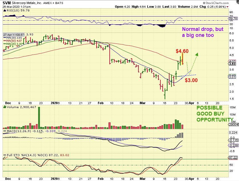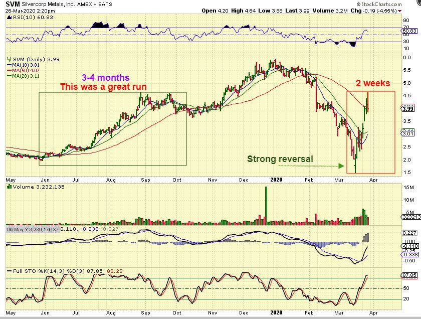 For example SVM – Buying that reversal at $1.50 to $4.60 is a HUGE move. A normal drop to the 10sma could take place, but it is also a big drop, so a great entry would be near the 10sma IF we get that drop. It also may just crawl sideways, so we have to wait and see.