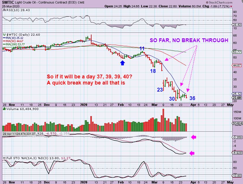 WTIC – Oil did NOT put in a low yet, and I have mentioned that Oil can bottom anywhere here or even after 40+ days. A drop to new lows from here would give us that low, but divergence is showing and the XOP is holding up, so Oil may rally soon too.
