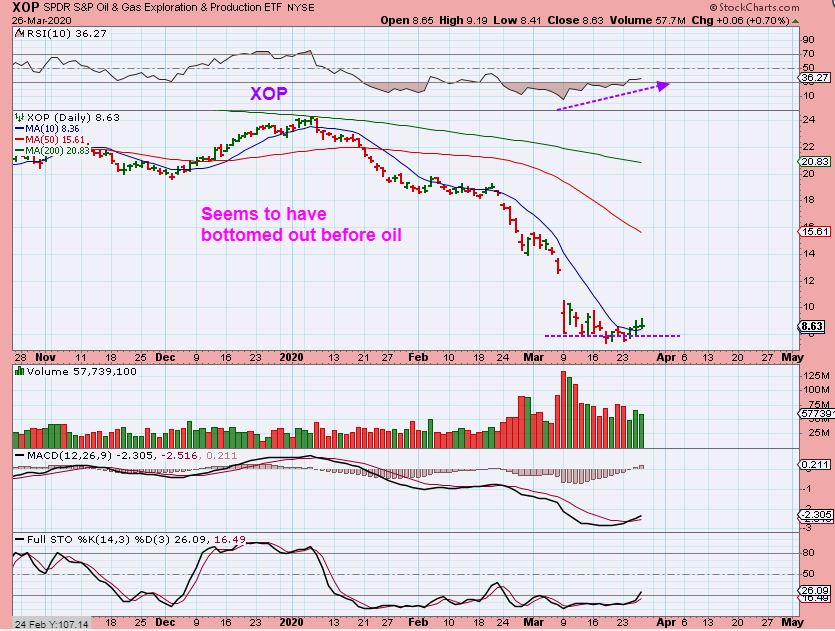 XOP – The XOP & many Oil Stocks are holing up and may not drop if Oil does. These look to be bottoming, with a MACD Cross and the RSI rising. When OIL bottoms, these stocks could rally Big. I mentioned ERF, TUSK, PUMP, BE, NOG, DNR, WTI, WLL, etc as stocks to watch.