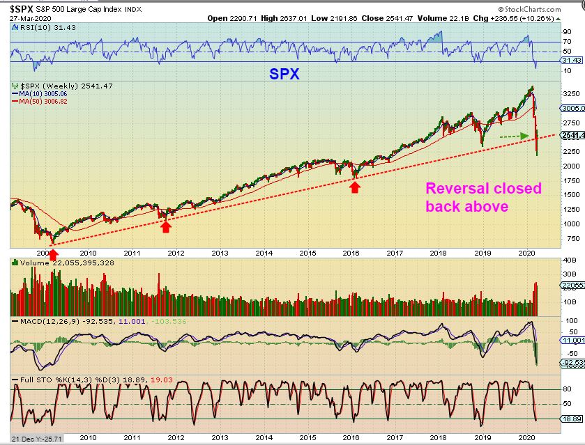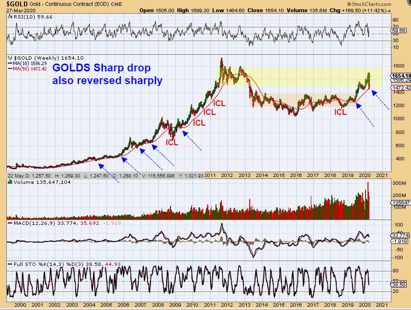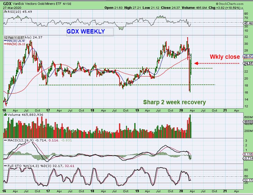 GDX WEEKLY – What a sharp sell off and recovery! Many people were stopped out of their position in Miners, and were no doubt too afraid to get back in. We bought visible reversals almost immediately and many of us enjoyed some great gains on this recovery already. For example: SVM tripled off of the lows already! Even getting in a bit late gave over 100% gains. These lows in Miners are probably THE LOWS going forward, with an ICL in place. What – A – Shake -Out!