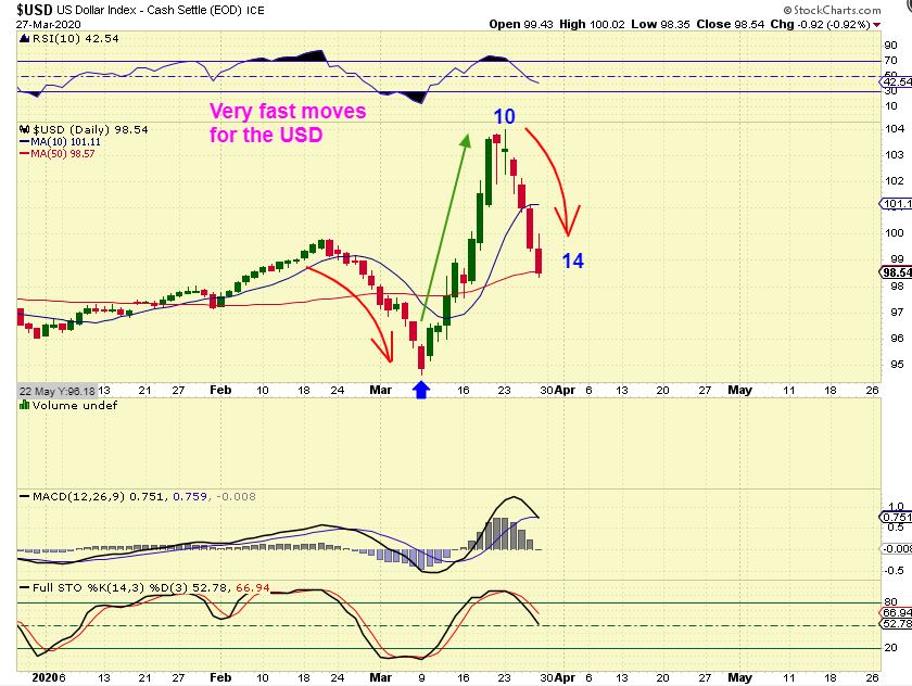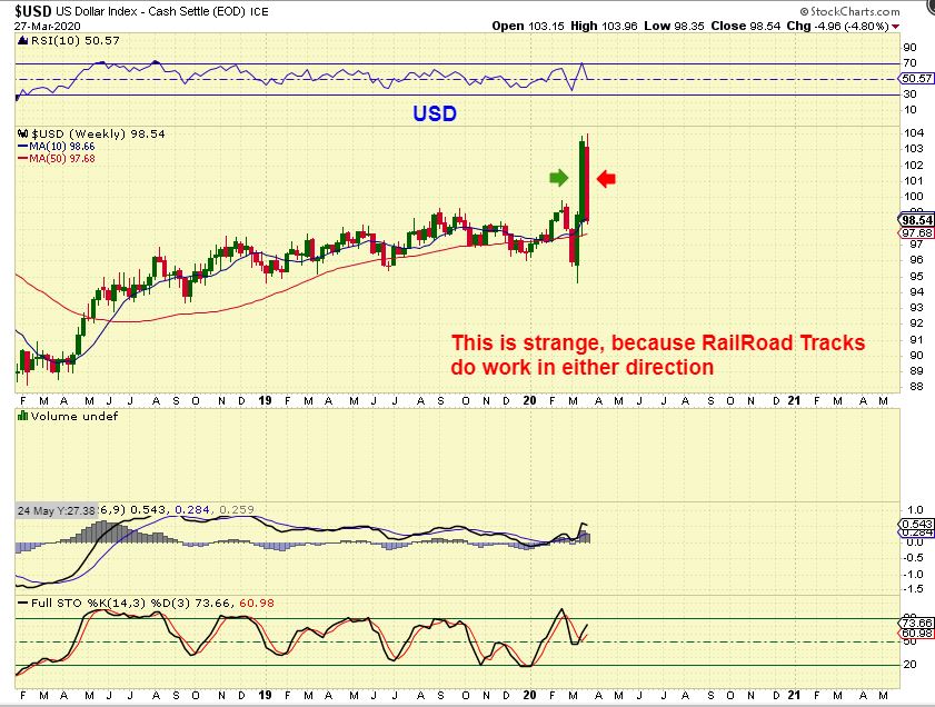 USD WEEKLY – These are Rail Road Track Highs, and they do work in both directions. IF THIS IS THE CASE, that means that we are seeing a top in the USD (though it can bounce) , and a low in Miners (though they can dip), which also showed Rail Road Track Lows. Very strange moves indeed. Once in a lifetime?
