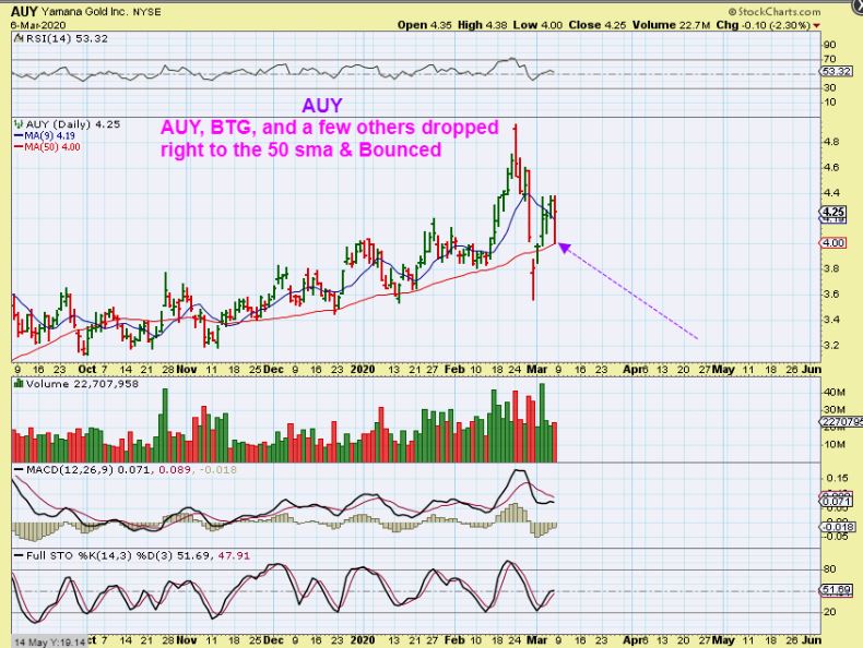 SIDENOTE: AUY, BTG , and a few other Miners dropped on Friday and then recovered. Most of you know that I have been in INO since around $4, I own MRNA, NVAX, BCX, SQQQ, and a few others too, and I also had added some AUY, BTG, a smaller JNUG position from the reversal lows. I wrote in the live commenting area ( below each daily chart) that I sold my Miners Friday. Why did I sell if this is above the 50sma? …