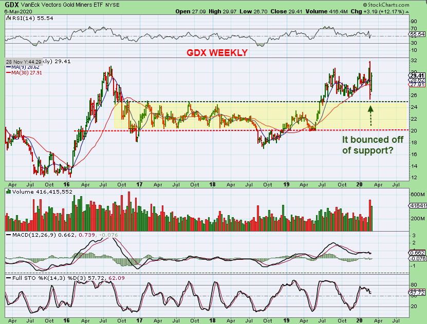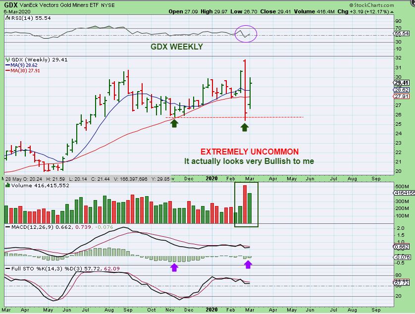GDX WEEKLY – Interestingly, Miners had that sharp burst lower and it actually just about tagged support and bounced back. So this view shows me that we really did have an anomaly in price action. Think about this: