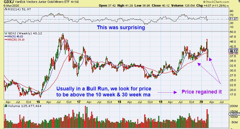 GDXJ WEEKLY – Here we see that Price sliced below the 30 week ma (Usually Bearish) and recovered (Usually Bullish). To be honest, this looks like ICL Price action, but it doesn’t fit Cycle timing and parameters. Let me show you a close up of GDXJ WEEKLY.