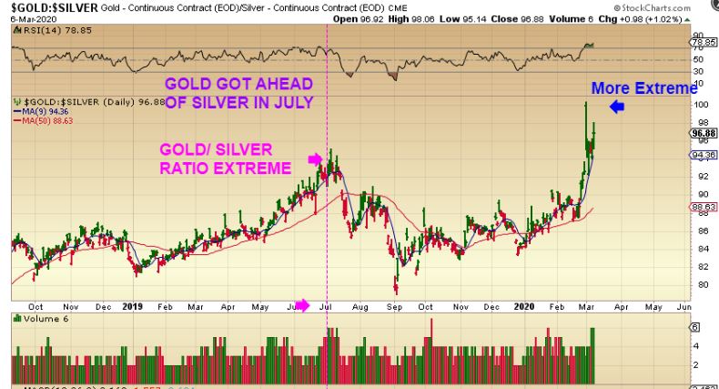 This is what I want to discuss about Silver (and it could affect Silver miners). What I see here must at least be in the back of my mind: This is the GOLD / SILVER RATIO AT AN EXTREME. It happened because Gold rallied and Silver flushed out. It was reading 100, and that is Big, Now take a look at this…