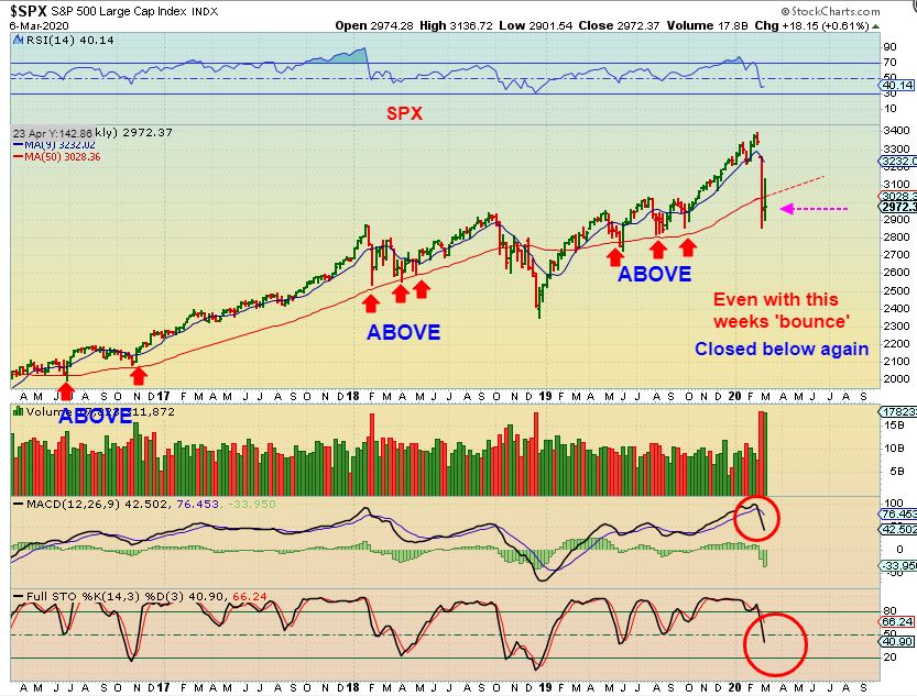 SPX WEEKLY – Notice that prior deeper drops landed on the 50 week M.A., expcept for the deeper sell off in 2018. We sliced right through it on this recent drop, and we closed under it last week and this week (despite the bounce). I am still short here.