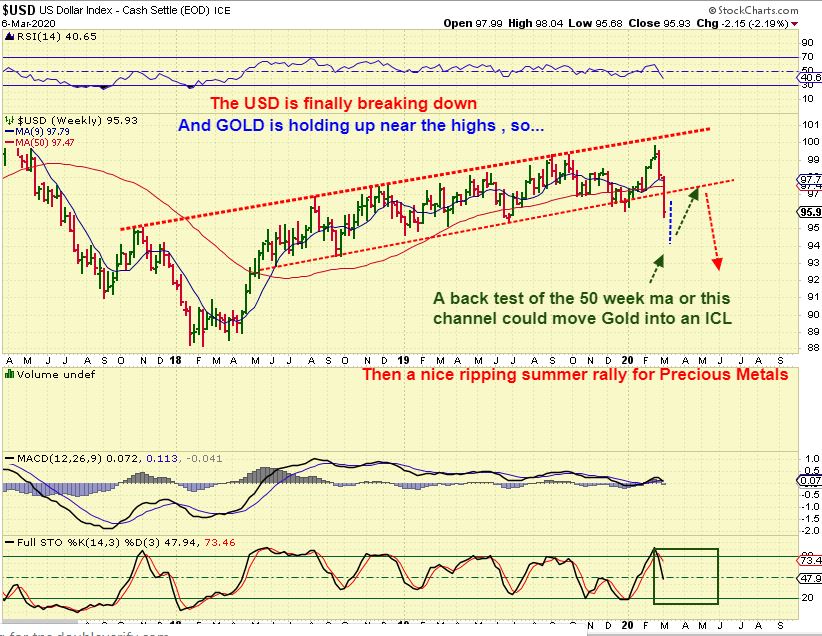 USD WEEKLY – The USD finally broke down, breaking below that slightly up sloping channel. Gold is up near the highs, but it is coming due for a dip relatively soon.
