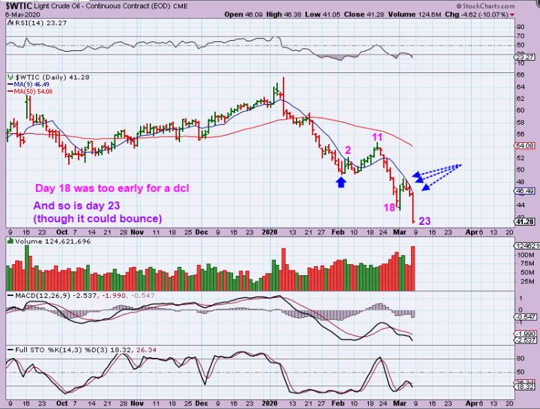 WTIC DAILY – It is only day 23, and Oil cannot get above that 10sma. I have been saying that Oil often does a daily cycle of 40-50 days. So this can bounce or chop like it did this week over to the 10 sma, , but it has weeks of time left for an even deeper drop.