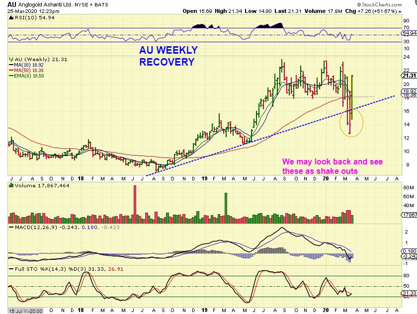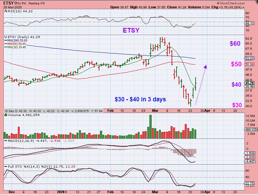ETSY – You can see that ETSY is recovering quickly. As an online retailer, they may also do well under the current environment. $30 to $40 is over 30%, but this can run to the 50sma at $50 or even higher. It remains very oversold.