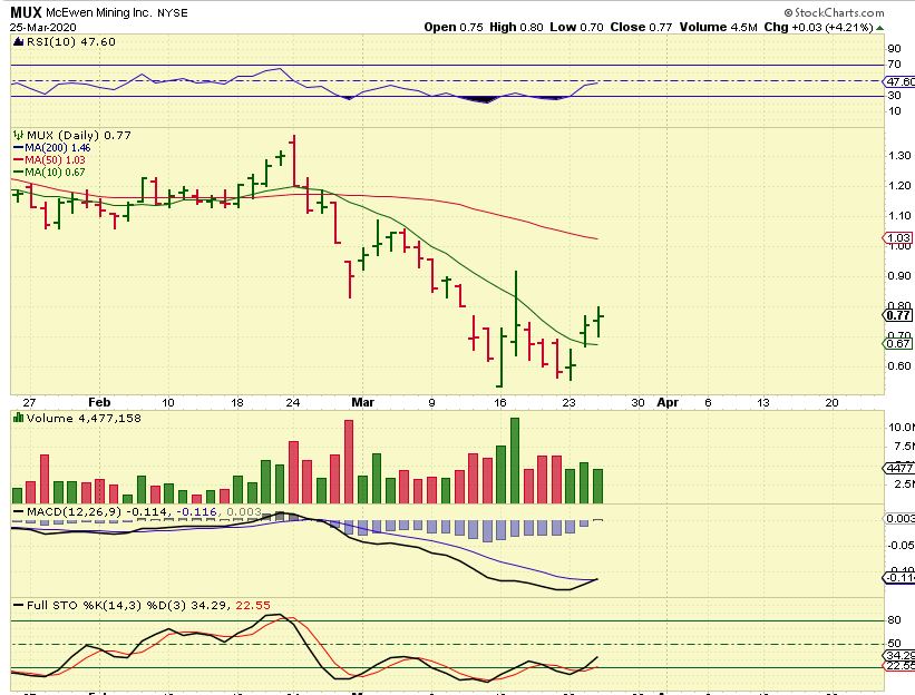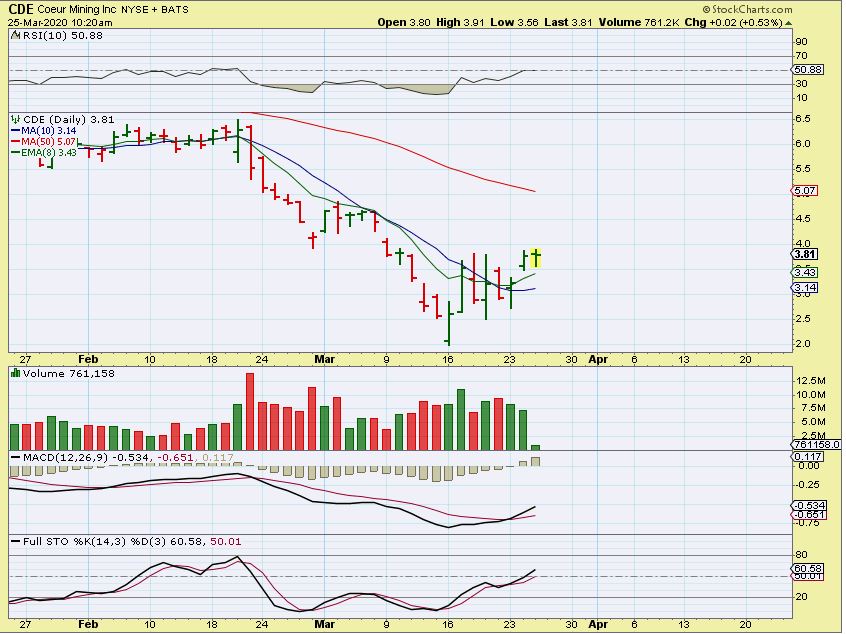 CDE – I have been pointing out some of the Miners that are well off of the lows, but they haven’t really had that strong ramp up higher. They are still lingering at the 10sma, and they can be bought with a stop close by. CDE can be bought here.