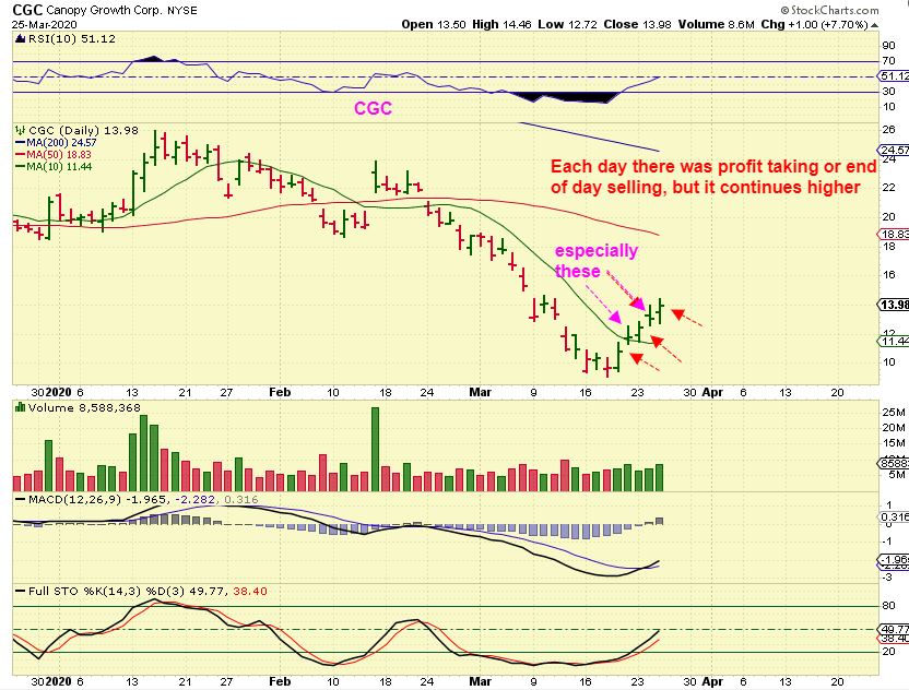 CGC – Notice when CGC started to run above the 10sma, it sold off into the close every single day, but still kept going higher.  That is what happens when we see ‘profit taking’.   Some people lock in their gains after a good day, but it does not mean that buyers wont be there the following day ( or short covering) .
