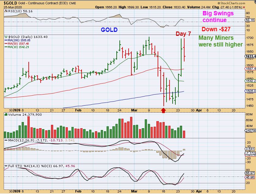 GOLD – Gold sold down $27, but Miners were still green trying to catch up. This should be day 7 and Gold almost broke to new highs already after a monster crash.