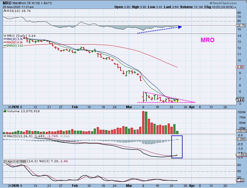 MRO  – I looked over some Oil / Energy stocks and a few really do look bullishly set up. This is a tight consolidation with a rising RSI & MACD. Notice how very oversold the stochastics is.