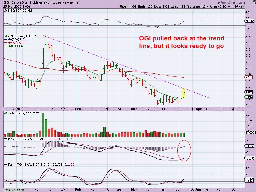 When OGI got above the 10sma, it popped about 20% to the down trend line and then sold off a bit.  It may be getting ready to break out and run.