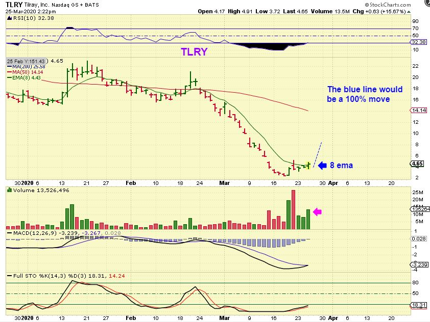 TLRY  – TLRY was right at the 10sma when I bought it near $4.55 and grabbed this chart and posted it in the live area. Almost immediately it ran another $1 higher to $5.50 and then sold down to $5.10, so THAT is how fast these move( In both directions).  I still own it, read the chart.