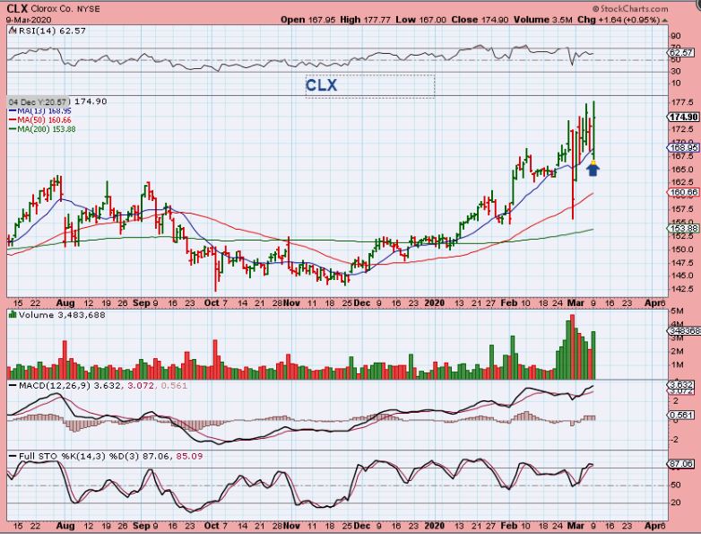 CLX – It has still been choppy, but CLOROX is hanging in there, since it is likley selling well with the spread of the Virus. So some stocks may do ok, but they are still a bit whip saw and it may be best for most to be patient and wait for some of this chop to stop, or Keep Positions Small!
