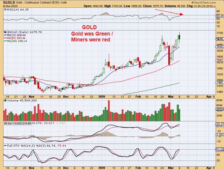 GOLD – Gold held up through the storm of the market sell off. I am seeing divergence in the RSI, so this does have the look of a double top. Did Silver & The Miners hold up?