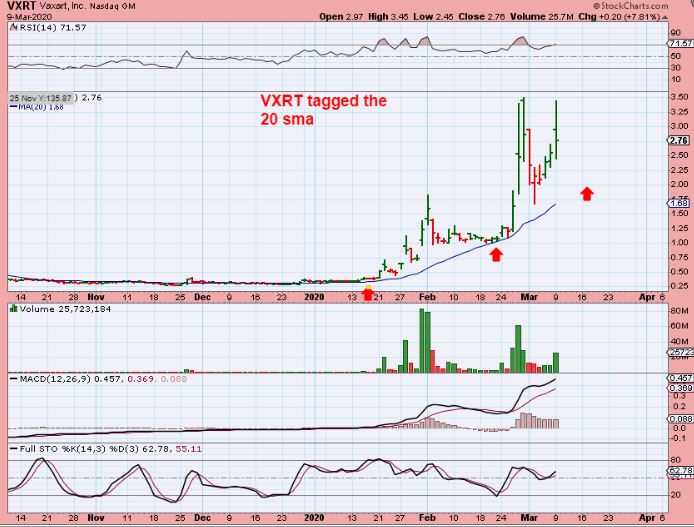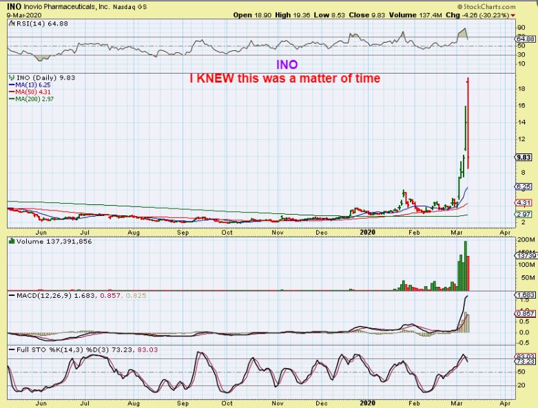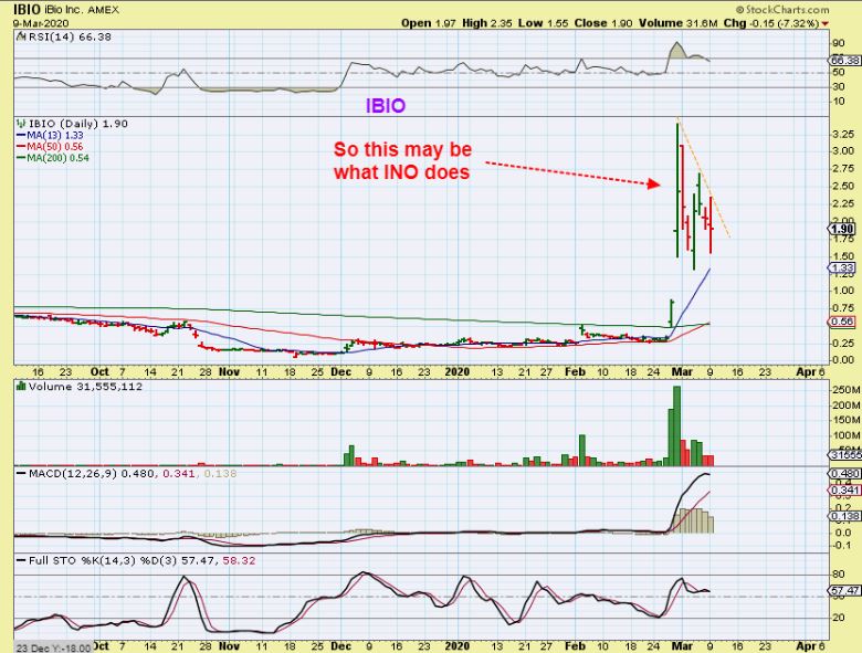 IBIO – I saw IBIO do something similar. It shot from 25 cents to $3.25, and then crashed to $1.25. The gains are excellent if you catch it right, but then the drop is deep! So INO COULD just flag like this one, and this may consolidate and then run higher again with the Coronavirus on the run. We’ll see…