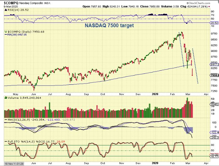 NASDAQ – I have had a 7500 measured move target for NASDAQ. I have expected it to get there in an A-B-C type drop like we are seeing, but a 1 or 2 day bounce to back test that 200sma can be anticipated.