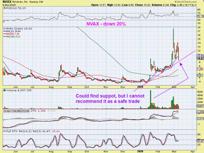 NVAX – There is a support line just below price, but it dropped all the way to $9.90 from a $14 peak last week. Let’s take another look…
