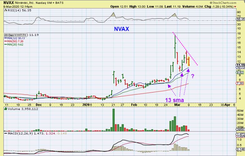 NVAX – See the red reversal day? Then it went to $11, $12, $13, $14. So far so good until yesterday. I drew this midday to show that it possibly was heading back to the 13 sma. I was still in it at $11, but gave $2 /share of gains back at that point.