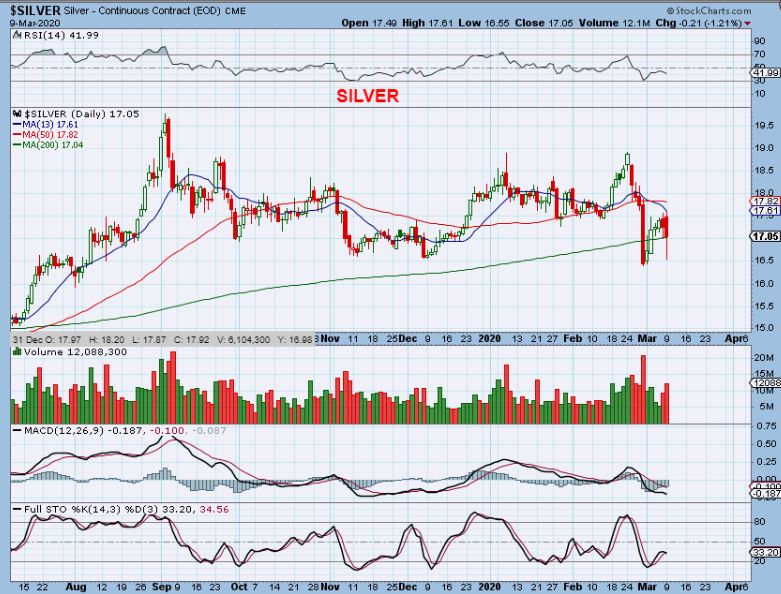 SILVER – Silver dropped and recovered, actually breaking the 200sma & re-gaining it. Volume on the drop was light, so normally this would be encouraging at the least. Silver may have put in a dcl last week, but then we have the Miners…