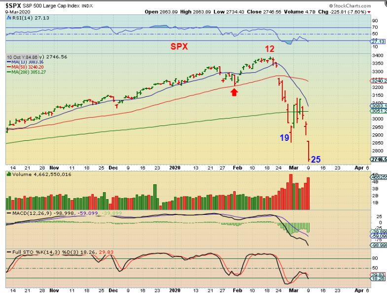 SPX – We still have more ‘time’ in the daily cycle. The reason that I would still expect more downside if we bounce here is that we are on day 25 ( Usually a daily cycle has around 35-40 days recently). COULD we get a shorter daily cycle if the selling is so extreme that it exhausts itself? Maybe we could, but I have to expect this to play out as a giant sell off in a 30+ day daily cycle. If you want to lock in some profit in SQQQ on the way down, that is prudent.