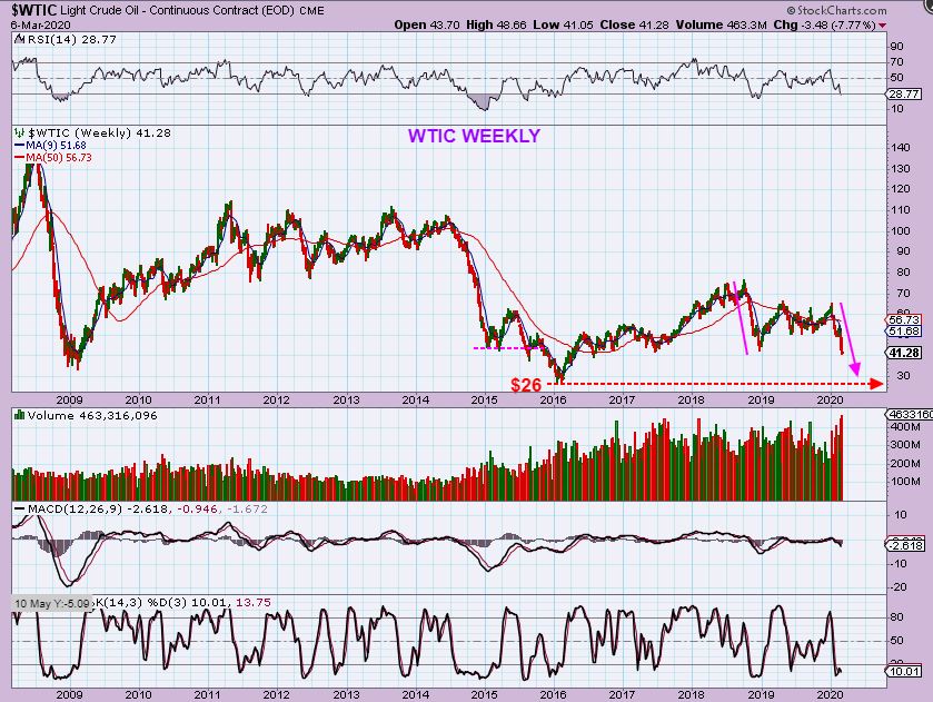 WTIC WEEKLY FEB 26 – Over a week ago I called for Oil to break down and drop to near $40 at first, and then a drop to prior lows is possible too. Prior lows were $26, so ….