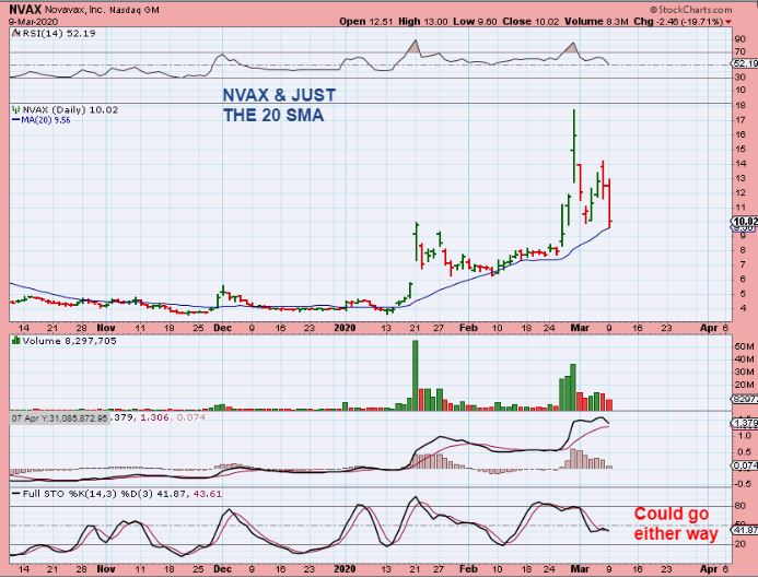 NVAX – Using only the 20sma, this may be support. By the close it dropped just below $10 when I was away at lunch and I had raised my stop above there above the 20 sma, so I just rode it from near $10 to $14 ( did not sell any this time like with INO) and back to $10 & stopped out . This MIGHT hold here & find support at the 20 sma, but what I’m saying is that I just gave all of my 4 day gains back in this chop, and that was at one point roughly gains of $4/share.