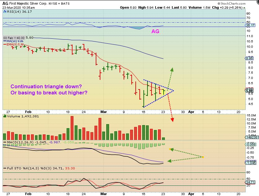 AG 10:30 a.m. Eastern – I used the same triangle after an hr of trading to show that AG ( I still own it) could be a reversal forming or a continuation pattern, so we look for a break one way or the other.