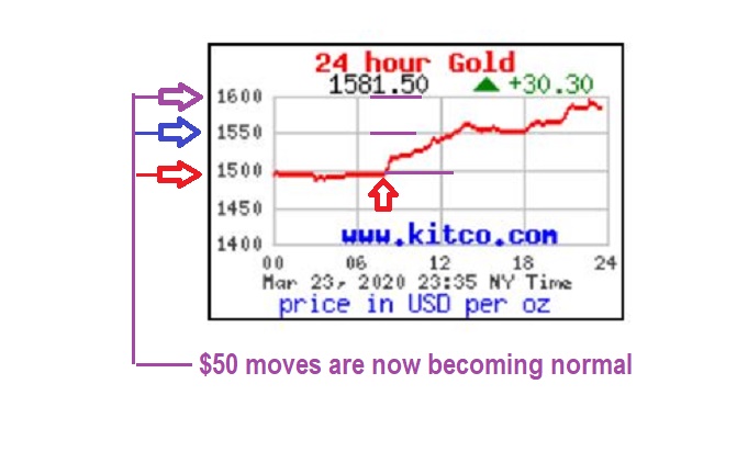 GOLD IS NOW MAKING $30- $50 MOVES AS PART OF NORMAL ACTION, and even $100 moves can take place in 24 hrs. Gold ran from $1482 to $1580 Sunday night to Monday night.