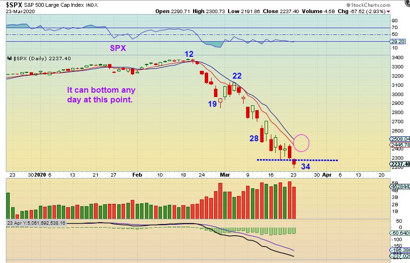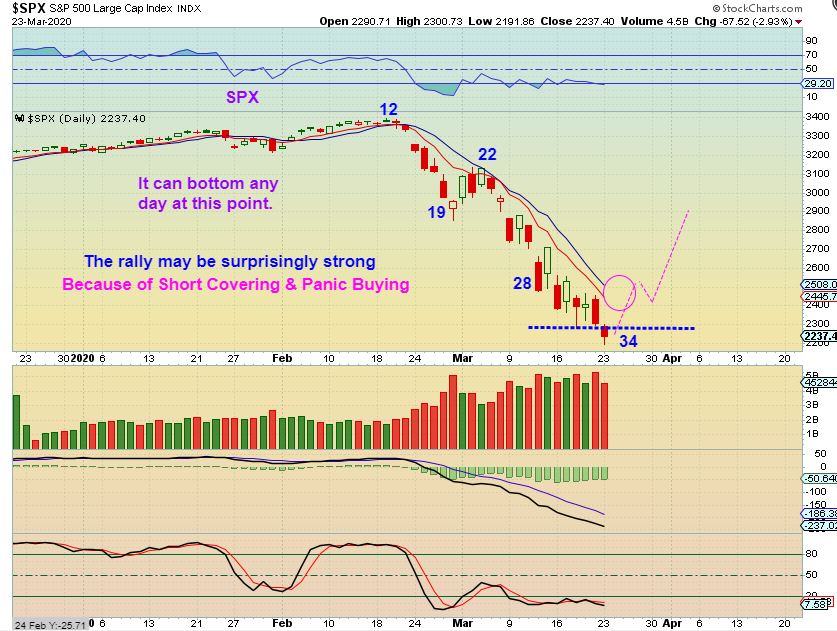 REMINDER FROM THE WEEKEND REPORT: SPX WEEKLY– My expectation is that we are entering a recession. As mentioned in past reports, many small businesses could go bankrupt under the current covid19 conditions. We can play the long side, but I’ll be ready to flip short after the bounce, looking for clues after we enter then 2nd daily cycle, if this is the ICL.