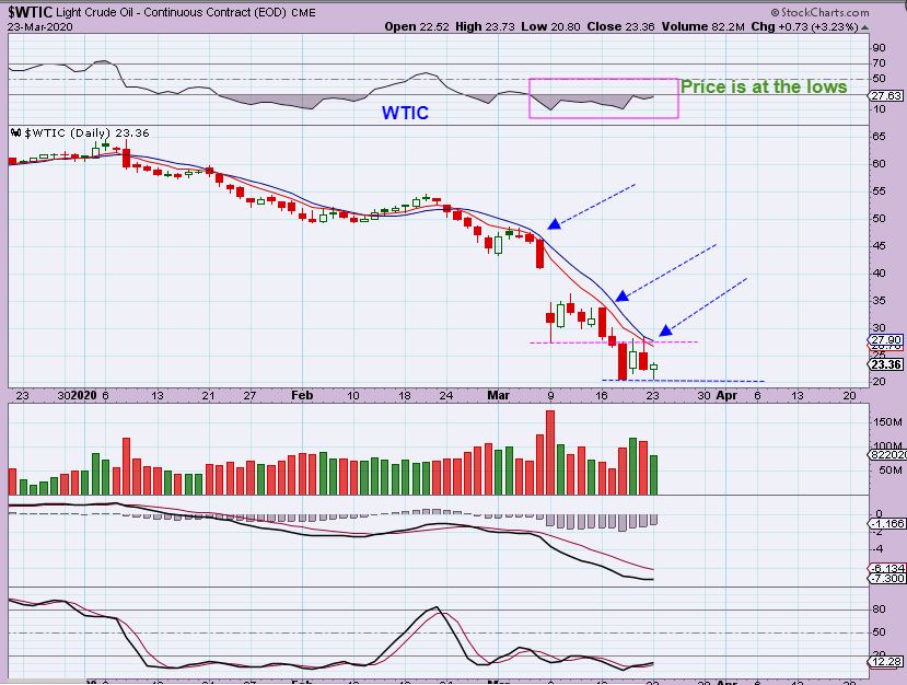 WTIC Monday – Oil actually did NOT break the lows, but it was close. This is day 33 or day 3, because while price is at the lows again, the RSI is showing strength.