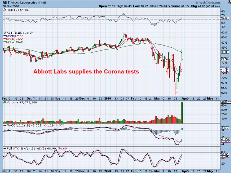 ABT  – Abbott supplies the test kits for the Corona Virus. It was also extremely choppy before last week, and very untrade-able.   I saw on the news that they are ramping up production of their rapid test kits for the virus.