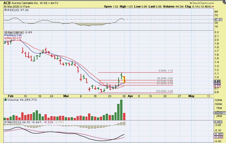 ACB –  $0.60 to $1.20 is a 100% gainer, but the 13% drop would not be fun if you entered late.