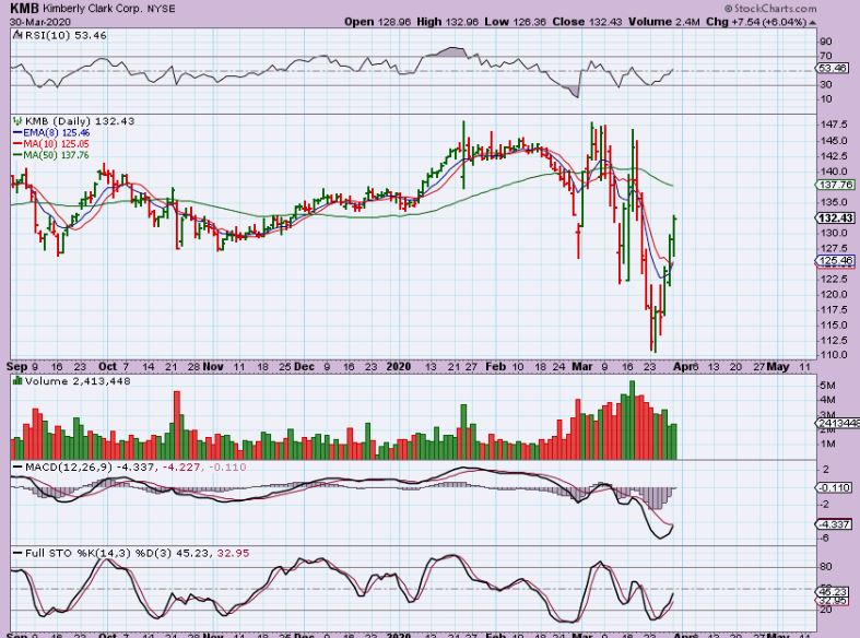 Kimberly Clark   – This was the first company that my wife mentioned in early March, and when I looked this stock up?   I said, “No Way!”.   It was chopping violently in the month of March.   This companies stock was extremely difficult to trade before last week,  but possibly as of last week, it may have bottomed?  It is now racing higher, but it could still get choppy.