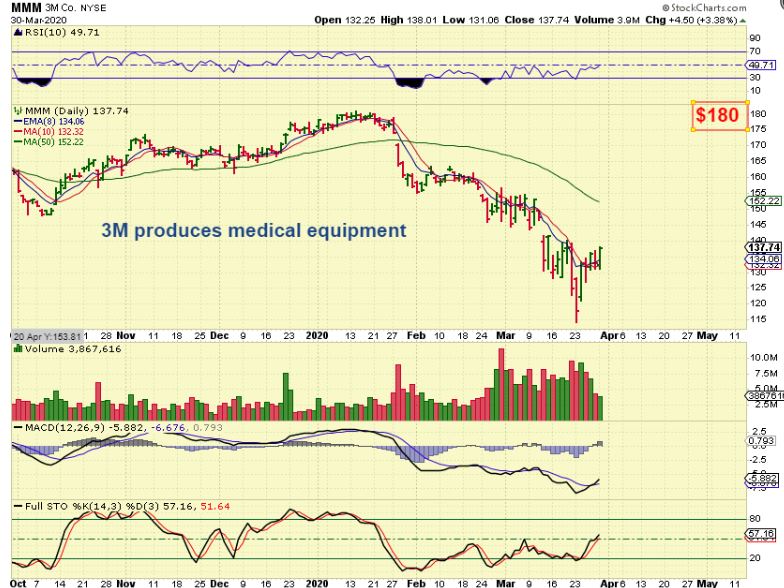 My wife works in a hospital, so I asked her which companies supply their safety equipment, Medical supplies, etc.  When she told me in early March about 3M, Kimberly Clark, Owens & Minor, etc, I looked up the stocks and they were acting horribly! They were selling off, extremely choppy, etc-  until last week. So I will present them here, and you can keep an eye on them. You can take a small position or wait to buy a pull back, but please note that these were trading VERY RADICALLY up until last week.