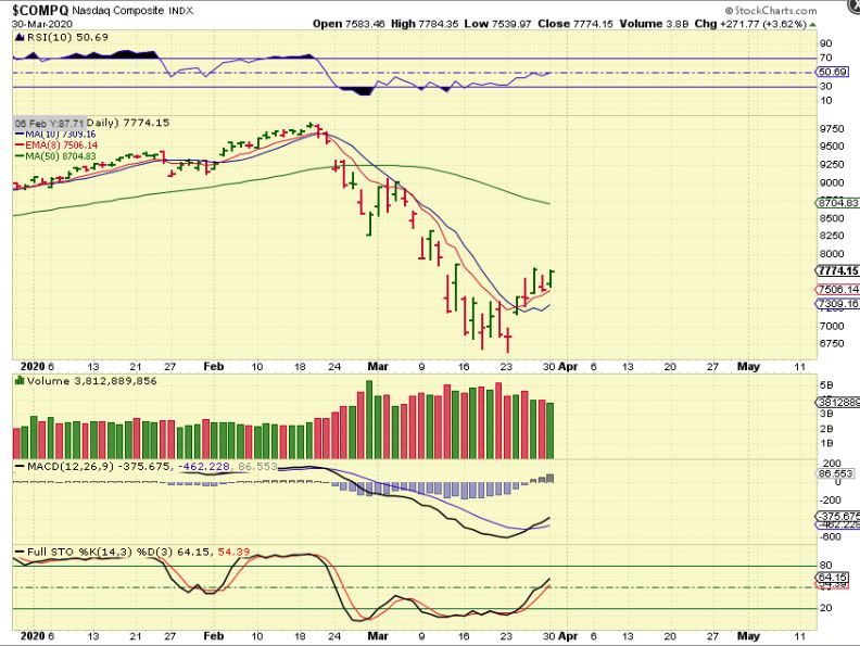 SPX – Monday saw the SPX climb up the 8 ema and it appears that the dip MIGHT be over. This CAN still drop to the 10sma, but so far the rally out of the lows continues. We discussed SPXL, SOXL, UDOW, UPRO, etc as leveraged trades, I expect these to continue higher over time.