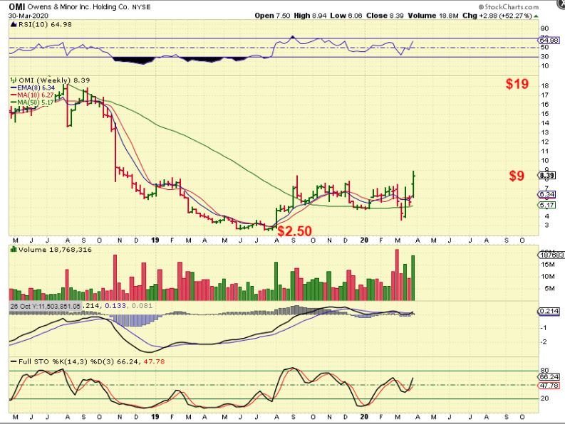 OMI – Owens and Minor is a medical supplier that manufactures and sources medical surgical products. This is a weekly chart that looks very promising, but I should mention that it just doubled from $4 to $8 in 3 weeks.